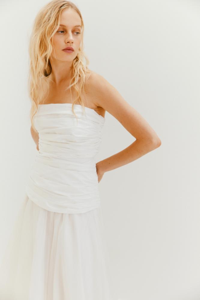 The dresses play with airy textures, sheer details, and clean lines, creating silhouettes filled with softness and freedom.